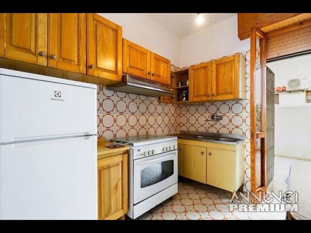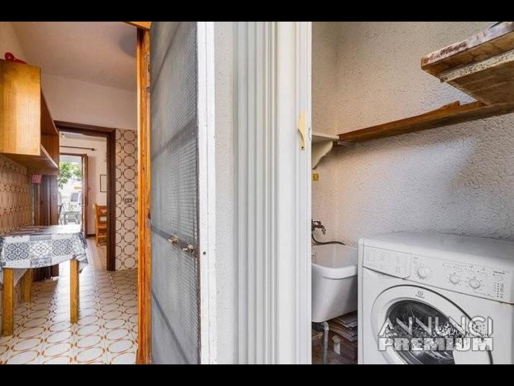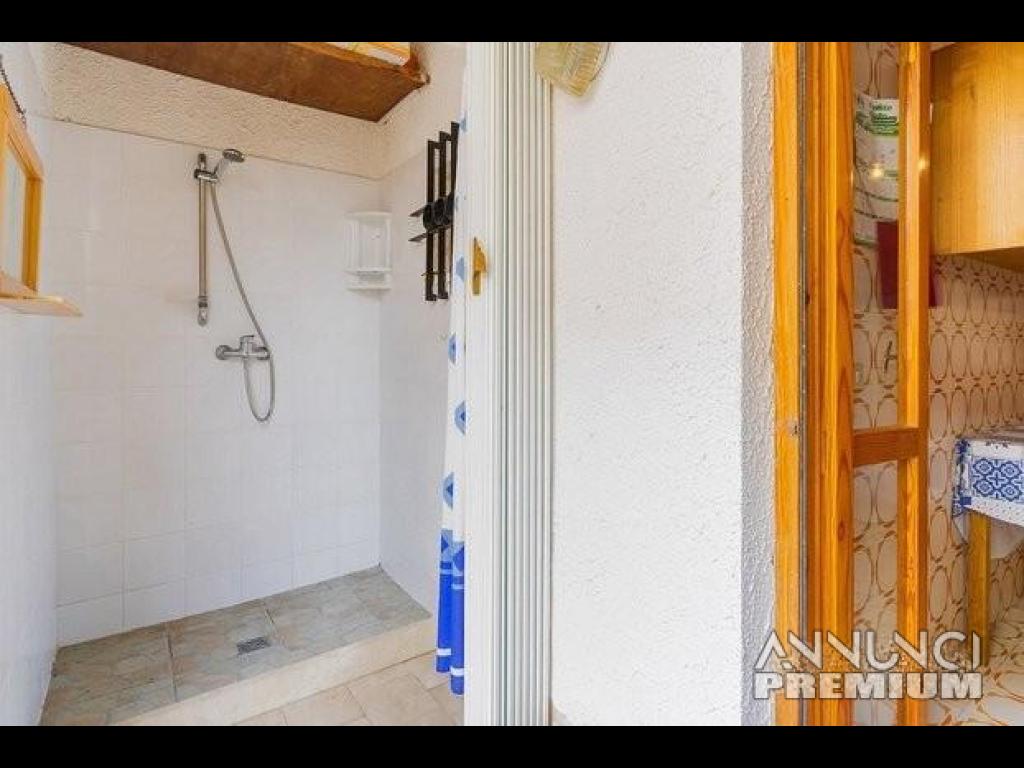 Cucinino attrezzato di tutto accollato ad un altro piccolo spazio esterno dove è presente una doccia esterna e lavatrice.