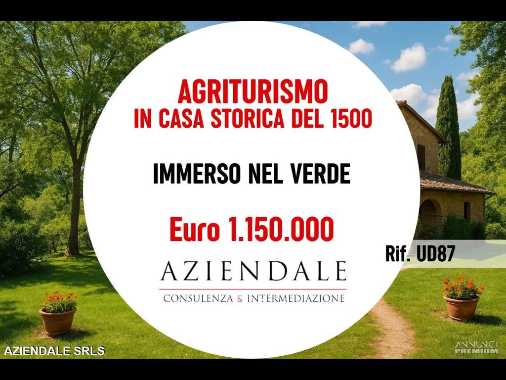 Rif. UD87 - AZIENDALE propone In zona limitrofa a Soave, immobile di charme con edificio originario del '500 immerso nel verde. Adibito da oltre vent'anni ad abitazione rurale e ad azienda agrituristica all'interno di un' azienda biologica certificata con vigneto, orto, frutteto, giardino brolo con frutti e rose antiche, erbario, box animali e un antico forno a legna per il pane. Ristrutturato nei fondamentali e nell'impiantistica, si presta ad abitazione di lusso con giardino, sede di rappresentanza aziendale e di uffici, nonchè a proseguire l'attività agrituristica con ristorazione, alloggio, attività didattiche e di vendita prodotti propri e del territorio. Parcheggio, grande barchessa per l'estate per 80/100 posti, con plateatico di 300 mq, ampio salone e una saletta più intima con camini e arredi di pregio fino a 60 posti. Cucina polifunzionale, ampia dispensa, cantinetta con annesso portico, 8 unità tutte con bagno per l'ospitalità, tra cui 3 junior suite e un appartamento autonomo, due bagni per il pubblico ed uno per il personale/bagno giorno. Prezzo di vendita a partire da Euro1.150.000 (struttura e giardino) , acquistabile un terreno bio in affitto di circa mq 7.000 condotto a seminativo a Euro 250.000. AZIENDALE 0452591245 – 3343859581 - Visita il nostro sito web AZIENDALEVERONA.IT e trova la tua opportunità tra le nostre oltre 250 proposte! L'indirizzo inserito non corrisponde all'ubicazione dell'attività, ma è puramente dimostrativo. Per ragioni di riservatezza nella trattativa, le foto pubblicate nel presente annuncio potrebbero non corrispondere alla realtà. Si prega non inviare e-mail senza recapiti telefonici e/o richiedere informazioni generiche previa contatto telefonico diretto al numero sopracitato in quanto non si rilascia alcuna informazione a sconosciuti riguardante l'attività in annuncio. Siamo in Verona Stradone Porta Palio n. 74/B a tua disposizione aperti al pubblico in orario 9/13 e 15.30/19