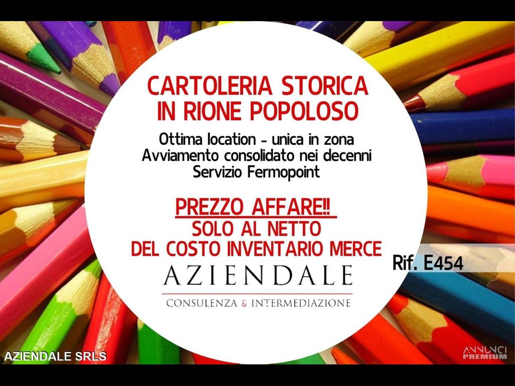 RIF. E454 - AZIENDALE propone la vendita di Cartoleria ubicata in rione popoloso, a 5 minuti dal centro storico, con avviamento consolidato nei decenni. Ottima location, unica in zona e punto di riferimento per la clientela locale, offre anche servizio di prenotazione libri scolastici, servizio Fermopoint (punto di ritiro e spedizione pacchi), locale di mq 50 con cantina al piano interrato. Attività ideale per lavorare in autonomia in quanto può essere gestita da una sola persona. Buon fatturato dimostrabile. Contratto di locazione vantaggioso a Euro 900 mensili. PREZZO AFFARE DI SOLI EURO 50.000 pari al solo valore della merce posta in vendita!!. AZIENDALE 0452591245 – 3343859581 - L'indirizzo inserito non corrisponde all'ubicazione dell'immobile, ma alla sede dell'agenzia. Si prega non inviare e-mail senza recapiti telefonici e/o richiedere informazioni generiche previa contatto telefonico diretto al numero sopracitato in quanto non si rilascia alcuna informazione a sconosciuti riguardante l'immobile in annuncio. Siamo in Verona Stradone Porta Palio n. 74/B a tua disposizione aperti al pubblico in orario 9/13 e 15.30/19.
