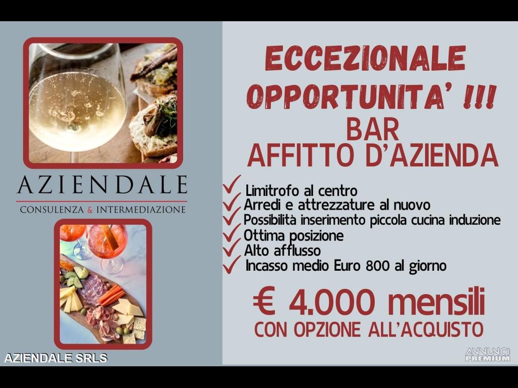 RIF. E389A - AZIENDALE propone l'affitto d'azienda di WineBar Osteria con arredi e attrezzatura al nuovo, possibilità di inserire piccola cucina a induzione, in ottima posizione su nota piazza limitrofa al centro, plateatico da 40 posti, incasso medio giornaliero Euro 800. Canone mensile affitto d'azienda di Euro 4.000 compreso immobile con eventuale opzione all'acquisto. Proposta riservata esclusivamente ad esperti del settore in grado di presentare adeguate garanzie professionali ed economiche. L'indirizzo inserito non corrisponde all'ubicazione dell'attività, ma alla sede dell'agenzia. INFO: Tel. 045 2591245 Cell. 334 3859581. Si prega non inviare e-mail senza recapiti telefonici e/o richiedere informazioni generiche previa contatto telefonico diretto al numero sopracitato in quanto non si rilascia alcuna informazione a sconosciuti riguardante l'attività in annuncio. Siamo in Verona Stradone Porta Palio n. 74/B a tua disposizione aperti al pubblico in orario 9/13 e 15.30/19.
