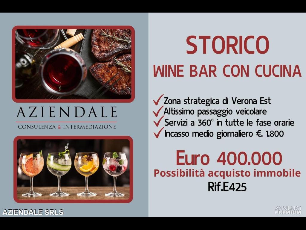 RIF. E425 - AZIENDALE propone in vendita una splendida opportunità unica nel suo genere di Wine Bar con cucina situato in una zona strategica di Verona est su strada statale principale ad altissimo passaggio veicolare con ampia possibilità di parcheggio. Attività che si sviluppa su mq 265 si presta a un servizio a 360 gradi in tutte le fasce orarie per tutti i tipi di clientela che passa dalle dolci colazioni alle succulenti pause pranzo per concludere con serate a tema aperitivo e coktail bar. Avviamento consolidato negli anni con consumo di kg 2 al giorno di caffè e 40 pause pranzo quotidiane per un incasso medio giornaliero di Euro 1.800. Gode inoltre di ampio plateatico privato di oltre 100 posti a sedere. Prezzo di vendita attività Euro 400.000 con possibilità acquisto immobile. Info: Tel. 045 2591245 - Cell. 334 3859581 - L'indirizzo inserito non corrisponde all'ubicazione dell'attività, ma è puramente indicativo. Si prega non inviare e-mail senza recapiti telefonici e/o richiedere informazioni generiche previa contatto telefonico diretto al numero sopracitato in quanto non si rilascia alcuna informazione a sconosciuti riguardante l'attività in annuncio.