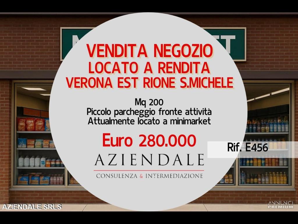 RIF. E456 - AZIENDALE propone la vendita di negozio commerciale in ottimo stato, strutturato su mq 200 al piano terra (con servizi) più magazzino sottostante di mq 50, ubicato in zona residenziale del rione di S.Michele con piccolo parcheggio fronte attività. Attualmente locato per esercizio attività di minimarket con rendita mensile di Euro 1.250. Prezzo di vendita Euro 280.000. AZIENDALE tel. 045 2591245 Cell. 334 3859581 - L'indirizzo inserito non corrisponde alla precisa ubicazione dell'immobile, ma è puramente indicativo. Si prega non inviare e-mail senza recapiti telefonici e/o richiedere informazioni generiche previa contatto telefonico diretto al numero sopracitato in quanto non si rilascia alcuna informazione a sconosciuti riguardante l'annuncio.