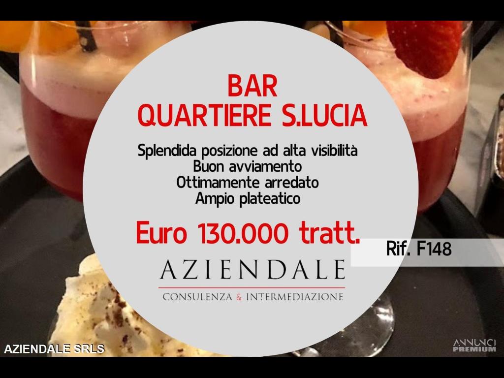 RIF. F148 - AZIENDALE propone la vendita di bar ubicato nel quartiere di S.Lucia in splendida posizione ad alta visibilità. L'attività si sviluppa su mq 130 con plateatico da 30 posti, ottimamente arredata, con al suo attivo un buon avviamento. Buon canone di locazione con scadenza 2036. Prezzo richiesto Euro 130.000. AZIENDALE tel. 045 2591245 Cell. 3343859581 - L'indirizzo inserito non corrisponde all'ubicazione dell'attività, ma è puramente indicativo. Si prega non inviare e-mail senza recapiti telefonici e/o richiedere informazioni generiche previa contatto telefonico diretto al numero sopracitato in quanto non si rilascia alcuna informazione a sconosciuti riguardante l'attività in annuncio.