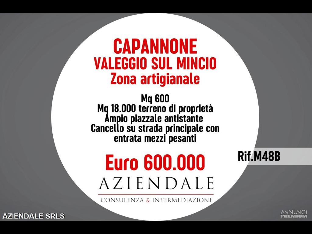 RIF. M48B - AZIENDALE propone nelle immediate vicinanze della zona artigianale di Valeggio Sul Mincio capannone di circa mq 600 con 18.000 mq di terreno di proprietà. Ampio piazzale antistante, cancello su strada principale con entrata mezzi pesanti. Prezzo richiesto Euro 600.000. AZIENDALE tel. 045 2591245 Cell. 334 3859581 - L'indirizzo inserito non corrisponde alla precisa ubicazione dell'immobile, ma è puramente indicativo. Si prega non inviare e-mail senza recapiti telefonici e/o richiedere informazioni generiche previa contatto telefonico diretto al numero sopracitato in quanto non si rilascia alcuna informazione a sconosciuti riguardante l'annuncio.