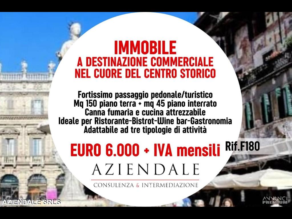 RIF.F180 - AZIENDALE - Nel cuore del centro storico di Verona, in posizione di forte passaggio pedonale e grande visibilità, propone in locazione/cessione un ampio immobile commerciale di circa 150 mq al piano terra, oltre a 45 mq di locali interrati. L’immobile, caratterizzato da ambienti accoglienti e con ottimo potenziale, dispone di canna fumaria e cucina attrezzabile, risultando ideale per attività di somministrazione di alimenti e bevande come ristorante, bistrot, wine bar o gastronomia. La disposizione interna consente tuttavia anche un facile adattamento ad altre tipologie di attività commerciali o artigianali, grazie alla posizione strategica, alla versatilità degli spazi e alla vicinanza con i principali punti di interesse turistico e commerciale della città. Richiesta € 6.000+iva al mese. INFO: 0452591245 - 3343859581 - L'indirizzo inserito non corrisponde all'ubicazione dell'attività, ma è puramente dimostrativo. Si prega non inviare e-mail senza recapiti telefonici e/o richiedere informazioni generiche previa contatto telefonico diretto al numero sopracitato in quanto non si rilascia alcuna informazione a sconosciuti riguardante l'attività in annuncio. Siamo in Verona Stradone Porta Palio 74/b, aperti al pubblico dalle 9 alle 13 e dalle 15.30 alle 19.