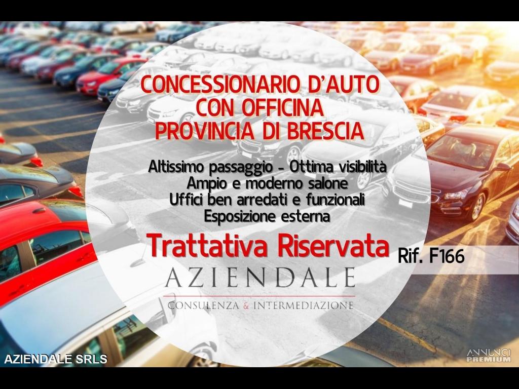RIF.F166 - AZIENDALE propone in vendita nella provincia di Brescia, stupendo concessionario d'auto con officina. Posizionato su strada ad altissimo passaggio, gode di un'ottima visibilità e, fronte salone dispone di parcheggio per le auto in mostra esterna. Ampio e moderno salone di esposizione, tutto vetrinato e con impiantistica rinnovata, con uffici funzionali e ben arredati. Completa il tutto un'officina attrezzata per le riparazioni meccaniche con vari carrelli ponte. Si cede con il parco macchine esistente tra usate e nuove da quantificare al momento della cessione. Si cede esclusivamente per cambioprogetti imprenditoriali. Trattative riservate. AZIENDALE tel. 045 2591245 - Cell. 3343859581. L'indirizzo inserito non corrisponde all'ubicazione precisa dell'attività, ma è puramente dimostrativo. Visita il nostro sito web AZIENDALEVERONA.IT e trova la tua opportunità tra le nostre oltre 250 proposte! Si prega non inviare e-mail senza recapiti telefonici e/o richiedere informazioni generiche previa contatto telefonico diretto al numero sopracitato in quanto non si rilascia alcuna informazione a sconosciuti riguardante l'attività in annuncio. Siamo in Verona Stradone Porta Palio n. 74/B con orario 9/13 e 15.30/19.
