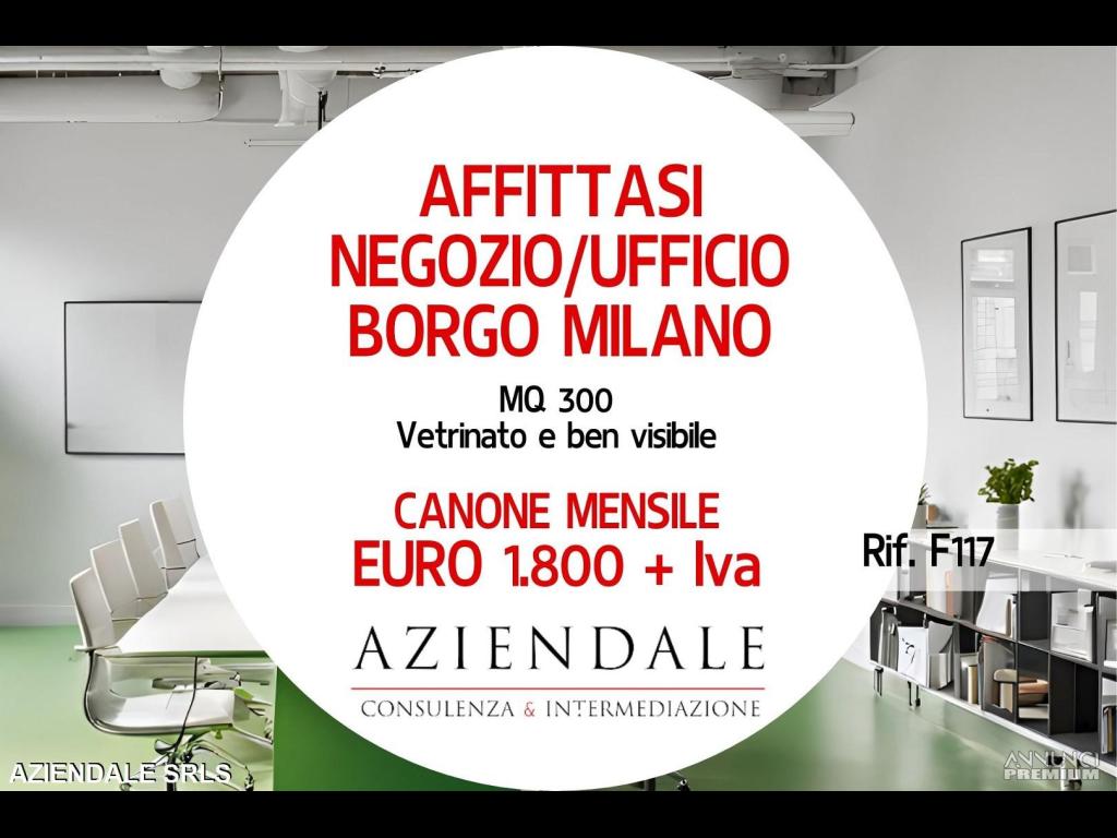 RIF. F117 - AZIENDALE propone in locazione immobile commerciale ufficio o negozio di circa mq 300 di cui mq 108 al piano terra, vetrinato, ben visibile e fronte strada e, mq 200 circa, al piano interrato. Impianti a norma e ben tenuto, in edificio di recente ristrutturazione. Canone mensile di locazione Euro 1.800 +Iva. AZIENDALE 0452591245 – 3343859581 - Si prega non inviare e-mail senza recapiti telefonici e/o richiedere informazioni generiche previa contatto telefonico diretto al numero sopracitato in quanto non si rilascia alcuna informazione a sconosciuti riguardante l'attività in annuncio. Siamo in Verona Stradone Porta Palio n. 74/B a tua disposizione aperti al pubblico in orario 9/13 e 15.30/19.