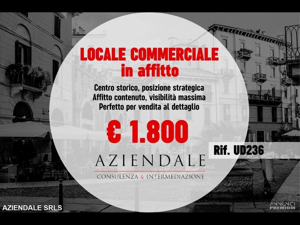 RIF. UD236 - Aziendale propone in locazione a pochi passi da due icone del centro storico di Verona, Piazza Bra e Castelvecchio, un locale commerciale di circa 30 mq, perfettamente proporzionato e dalla pianta quadrata, ideale per attività di vendita al dettaglio, proprietà non disponibile per somministrazione alimentare. Il locale si presenta libero da subito, con una vetrina su strada, ottima visibilità pedonale e un canone di locazione contenuto, particolarmente vantaggioso per la posizione.Disponibilità immediata. Richiesta garanzia pari a 6 mensilità del canone e 3 mensilità a titolo di deposito cauzionale.Posizione centralissima e ad alto passaggio.Perfetto per attività retail (no food, no ATM). Libero da subito. Canone di locazione mensile Euro 1.800. INFO: Tel. 045 2591245 Cell. 334 3859581. La posizione inserita non corrisponde all'esatta ubicazione dell'attività, ma è puramente dimostrativo. Si prega non inviare e-mail senza recapiti telefonici e/o richiedere informazioni generiche previa contatto telefonico diretto al numero sopracitato in quanto non si rilascia alcuna informazione a sconosciuti riguardante l'attività in annuncio.