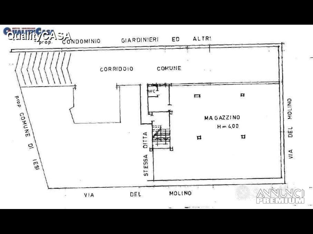 Agenzia immobiliare QualityCasa propone in vendita MAGAZZINO / GARAGE zona piscina a Jesi di 215 m: Ingresso, vano unico, ripostiglio, bagno, porta carraia e 2 finetre alte, altezza 4 metri e uso della corte condominiale. Discrete condizioni. Possibile suddividerlo in 3 garage.