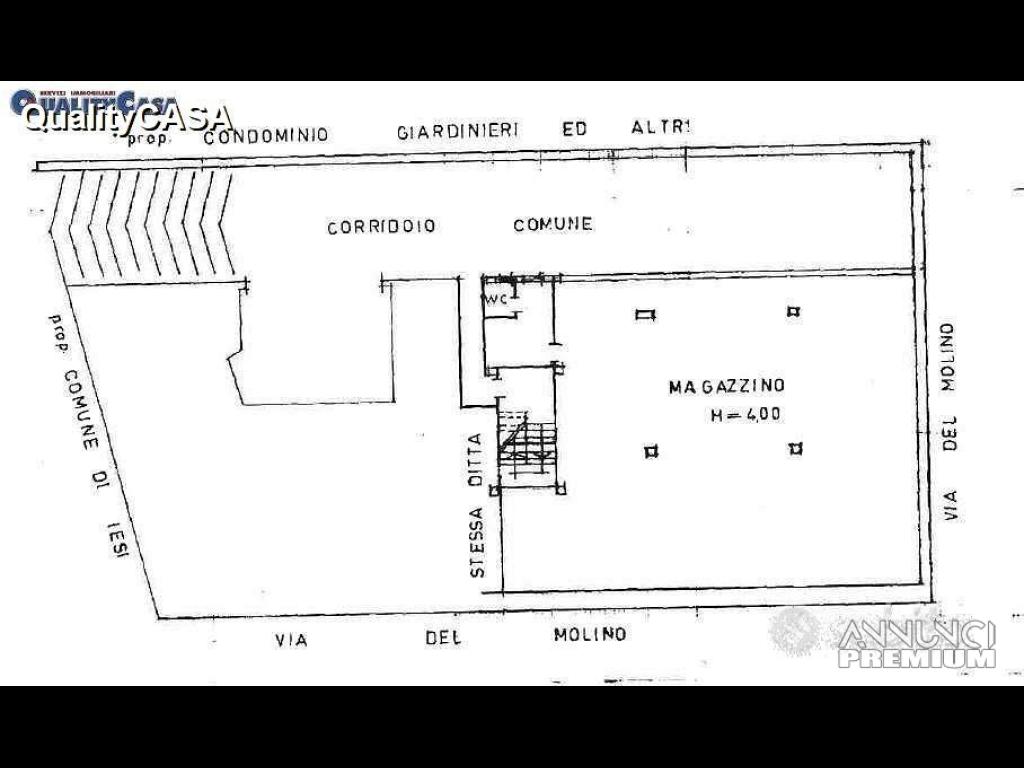 Agenzia immobiliare QualityCasa propone in vendita MAGAZZINO / GARAGE zona piscina a Jesi di 215 m: Ingresso, vano unico, ripostiglio, bagno, porta carraia e 2 finetre alte, altezza 4 metri e uso della corte condominiale. Discrete condizioni. Possibile suddividerlo in 3 garage.