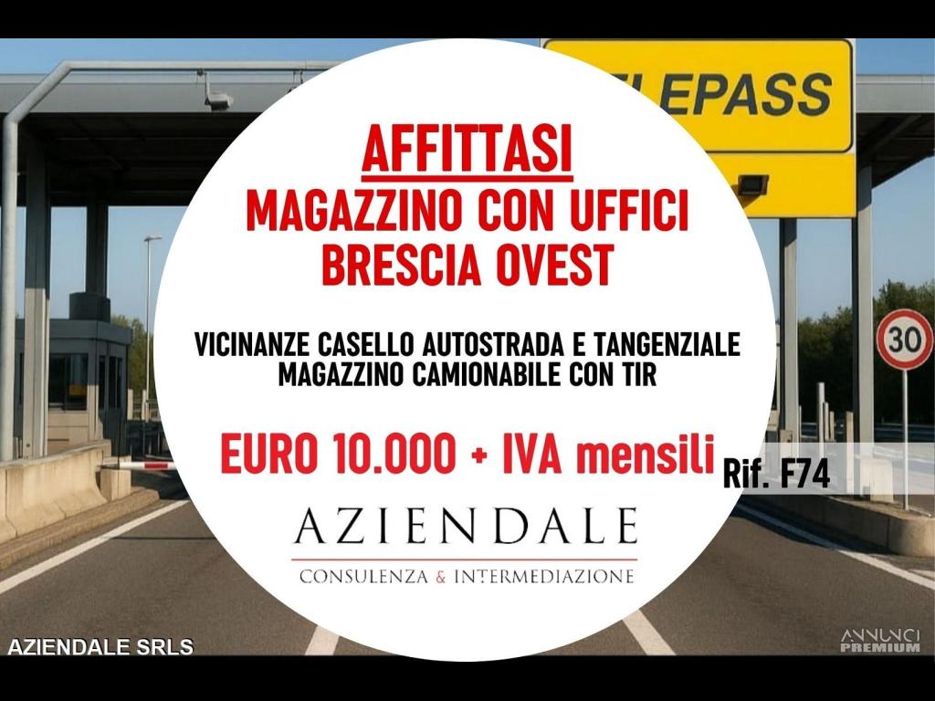 RIF. F74 - AZIENDALE propone in locazione a Brescia Ovest, vicinanze casello autostrada e tangenziale, magazzino camionabile con tir, di mq. 2.500 al piano seminterrato, più mq.500 di uffici al piano terra e altri mq.1.000 esterni coperti. Canone di locazione mensile Euro 10.000 +IVA. AZIENDALE 0452591245 – 3343859581 - Per ragioni di riservatezza, le foto e l'indirizzo pubblicato nel presente annuncio non corrispondono alla realtà, ma sono puramente dimostrative. L'indirizzo inserito non corrisponde all'ubicazione dell'attività, ma è puramente dimostrativo. Si prega non inviare e-mail senza recapiti telefonici e/o richiedere informazioni generiche previa contatto telefonico diretto al numero sopracitato in quanto non si rilascia alcuna informazione a sconosciuti riguardante l'attività in annuncio. Siamo in Verona Stradone Porta Palio n. 74/B a tua disposizione aperti al pubblico in orario 9/13 e 15.30/19.