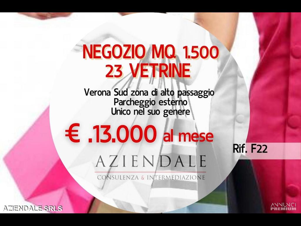 Rif. F22 AZIENDALE propone la locazione di un negozio di mq 1.000, più mq. 500 di magazzino, in zona Verona Sud a pochi minuti dal centro storico, con parcheggio esterno. Strada ad alto passaggio veicolare e con fermate bus. Posizione interessante con ben 23 vetrine . Prezzo di locazione annuo richiesto Euro 150.000. AZIENDALE 0452591245 – 3343859581 - Visita il nostro sito web AZIENDALEVERONA.IT e trova la tua opportunità tra le nostre oltre 250 proposte! Per ragioni di riservatezza, le foto e l'indirizzo pubblicato nel presente annuncio non corrispondono alla realtà, ma sono puramente dimostrative. L'indirizzo inserito non corrisponde all'ubicazione dell'attività, ma è puramente dimostrativo. Si prega non inviare e-mail senza recapiti telefonici e/o richiedere informazioni generiche previa contatto telefonico diretto al numero sopracitato in quanto non si rilascia alcuna informazione a sconosciuti riguardante l'attività in annuncio. Siamo in Verona Stradone Porta Palio n. 74/B a tua disposizione aperti al pubblico in orario 9/13 e 16/19.