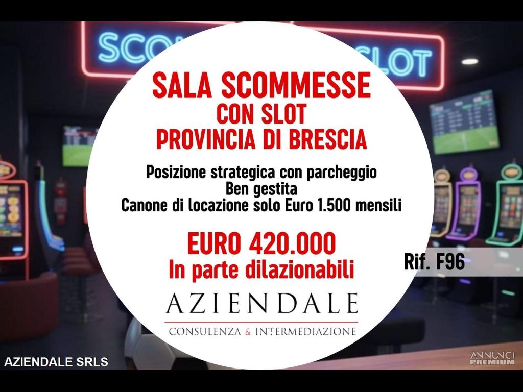 RIF.F96 - AZIENDALE propone in provincia di Brescia Sala Scommesse con Slot, storica e ben gestita, in posizione strategica in complesso altamente commerciale. Vanta aggi per Euro 30.000 mensili, con modeste spese di gestione e basso canone di locazione, Euro 1.500 No Iva, mensili. Si sviluppa su una superficie di mq 150. Richiesta Euro 420.000 in parate dilazionabile. Aziendale 0452591245 - 3343859581. L'indirizzo inserito non corrisponde all'ubicazione dell'attività, ma è puramente dimostrativo. Si prega non inviare e-mail senza recapiti telefonici e/o richiedere informazioni generiche previa contatto telefonico diretto al numero sopracitato in quanto non si rilascia alcuna informazione a sconosciuti riguardante l'attività in annuncio. Siamo in Verona Stradone Porta Palio n.74/b, aperti al pubblico con il seguente orario: 9/13 e 15.30/19
