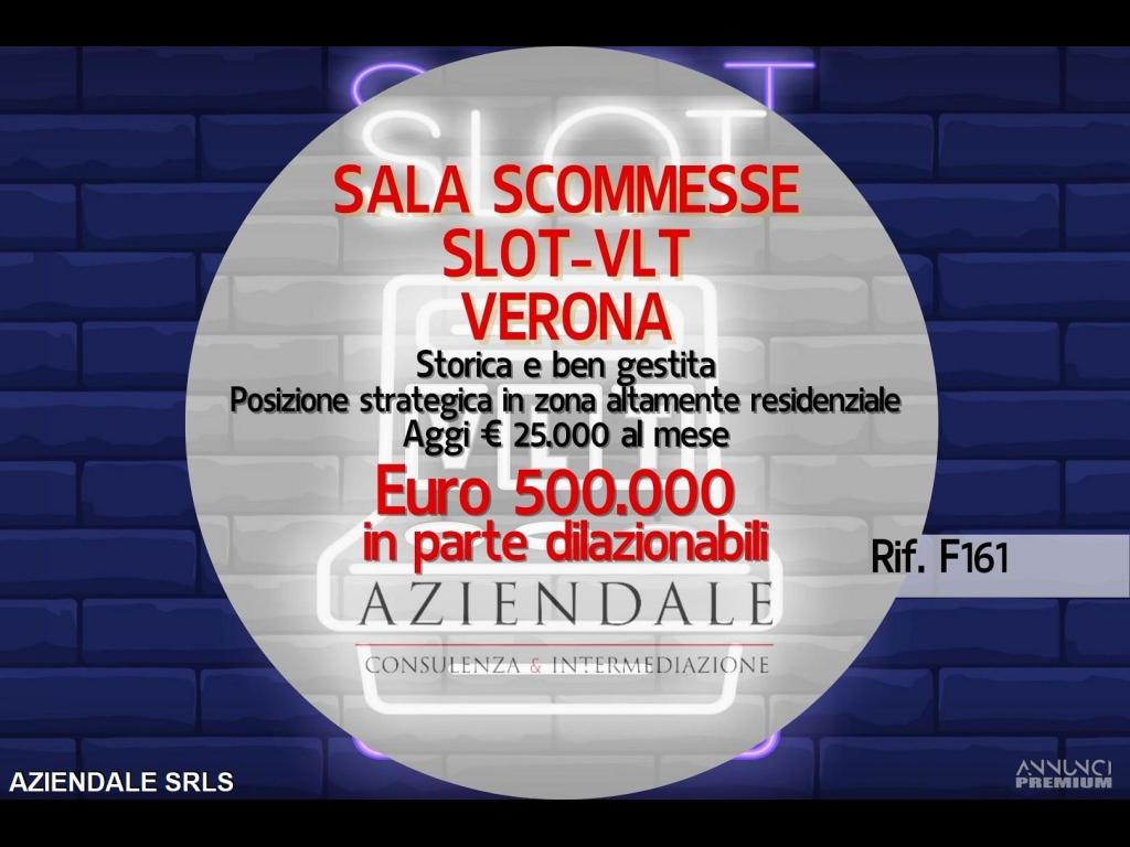 RIF. F161 - Aziendale propone in vendita a Verona Sala Scommesse con Slot e Videolottery, storica e ben gestita, in posizione strategica in zona altamente residenziale. Vanta aggi per Euro 25.000 mensili, con modeste spese di gestione e basso canone di locazione, Euro 2500 No Iva, mensili. Si sviluppa su una superficie di mq 150. Richiesta Euro 500.000 in parte dilazionabile. AZIENDALE Tel.: 045 2591245 - Cell. 334 3859581 - L'indirizzo inserito non corrisponde all'ubicazione dell'attività, ma è puramente dimostrativo. Si prega non inviare e-mail senza recapiti telefonici e/o richiedere informazioni generiche previa contatto telefonico diretto al numero sopracitato in quanto non si rilascia alcuna informazione a sconosciuti riguardante l'attività in annuncio.