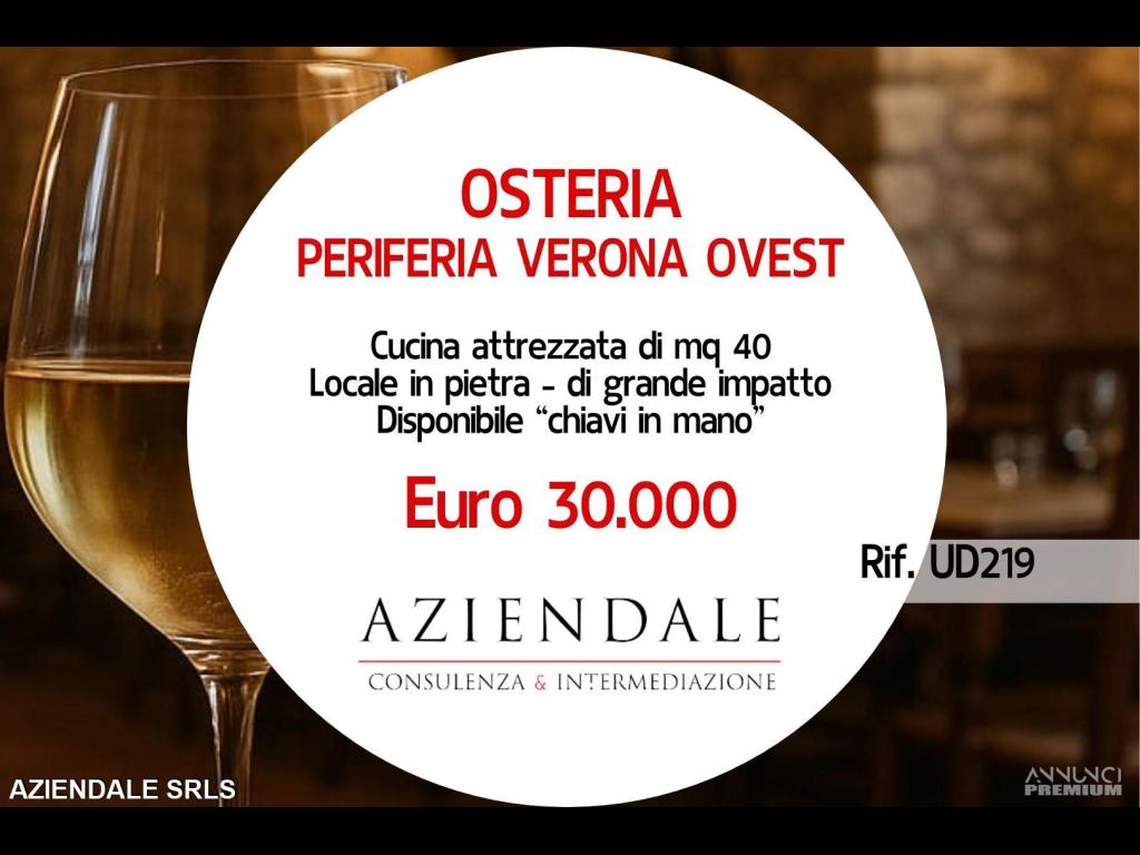 RIF. UD219 - AZIENDALE propone affascinante trattoria in stile osteria, situata in un contesto dal grande fascino con pareti in pietra a vista e pavimento originale in pietra, elementi che regalano all’ambiente un’atmosfera calda e autentica. La cucina, spaziosa e funzionale con i suoi 40 mq, è adatta a sostenere anche volumi importanti. Attività storica e ben conosciuta nel territorio, attualmente in fase di rilancio: si presta perfettamente per un nuovo gestore con idee e passione per la ristorazione tradizionale. La proposta comporta una trattativa riservata direttamente con la proprietà, per il canone d'affitto. Occasione ideale per chi desidera iniziare subito, con locali già pronti e un’identità da valorizzare. AZIENDALE tel. 0452591245 oppure cell. 3343859581 - Per ragioni di riservatezza nella trattativa, le foto pubblicate nel presente annuncio potrebbero non corrispondere alla realtà. L'indirizzo inserito non corrisponde all'ubicazione dell'attività, ma è puramente dimostrativo. Si prega non inviare e-mail senza recapiti telefonici e/o richiedere informazioni generiche previa contatto telefonico diretto al numero sopracitato in quanto non si rilascia alcuna informazione a sconosciuti riguardante l'attività in annuncio.