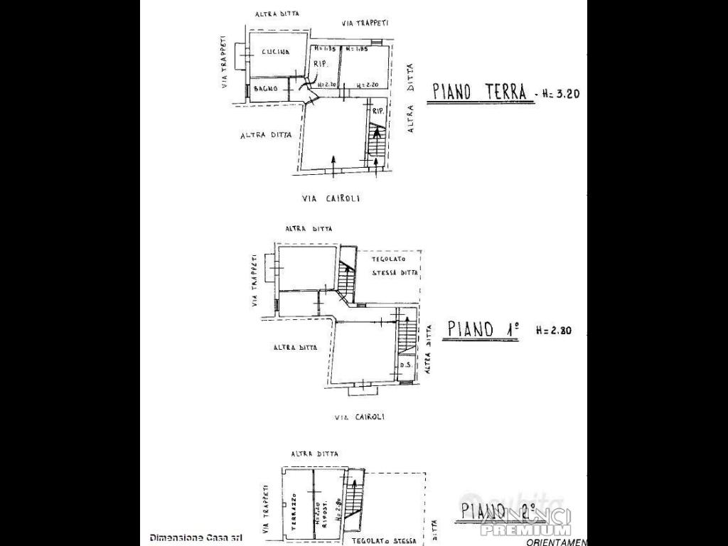 L'immobile risulta così composto: piano terra con salone, cucina con balcone, bagno, ripostiglio e camera; piano primo con due camere, entrambe con balcone, e bagno; piano secondo con terrazzino e dependance.