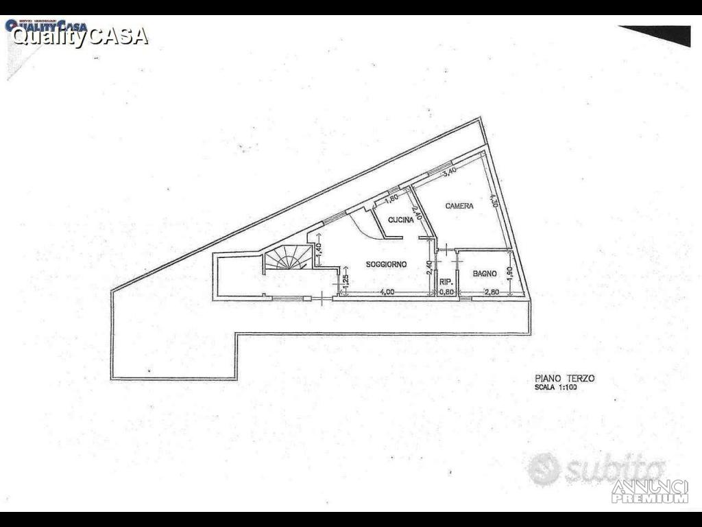 - Appartamento piano terzo: ingresso, soggiorno con camino, cucinotto, camera, bagno, ripostiglio, balcone perimetrale, terrazzo e posto auto esterno.