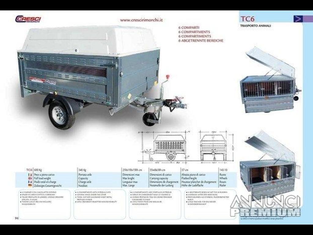 Rimorchio nuovo omologato trasporto cani marca Cresci rimorchi modello TC6 coibentato con freni con peso a pieno carico 600 Kg,portata utile 340Kg.