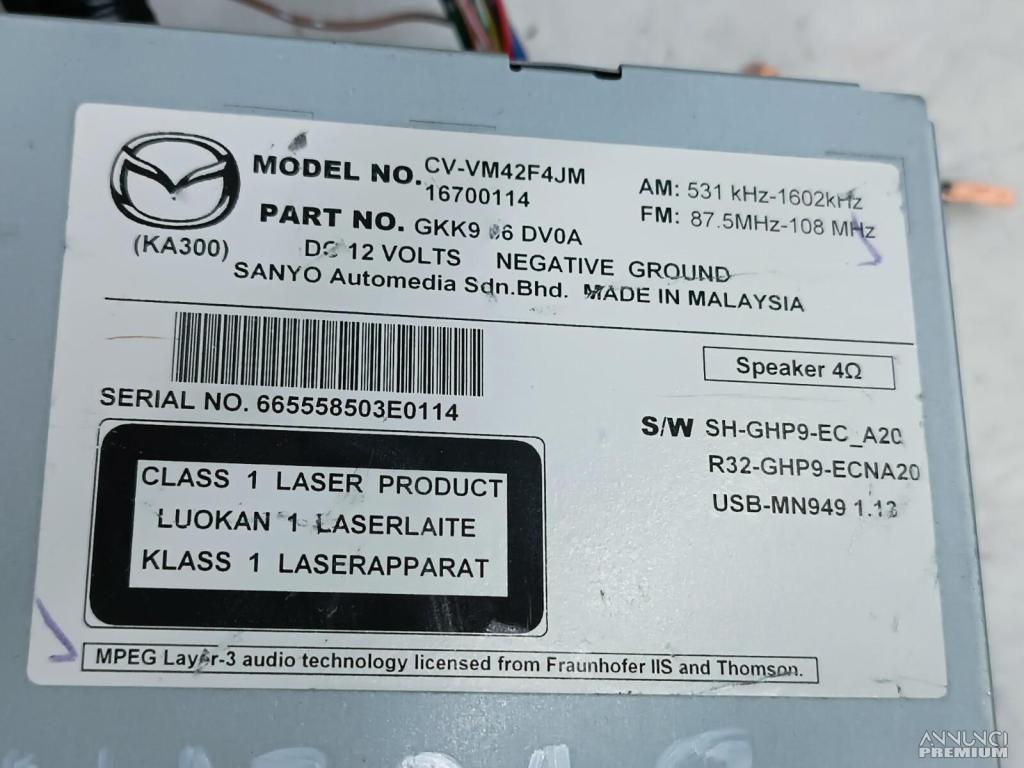 AUTORADIO LETTORE CD SCHERMO MULTIMEDIA NAVIGATORE MAZDA 6 2014 GKK966DV0A A2
