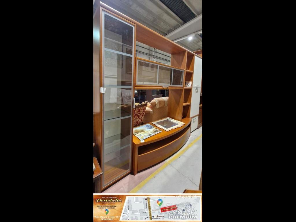 PARETE ATTREZZATA STILE MODERNO CON VETRINA LATERALE E CENTRALE SOPRASTANTE COLORE CILIEGIO E BIANCO (L CM 286 X P CM 41 X H CM 220)