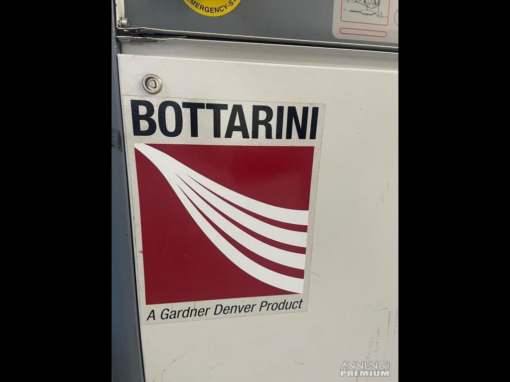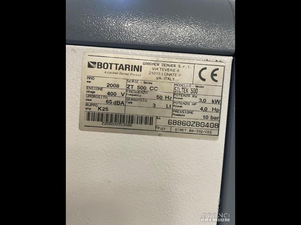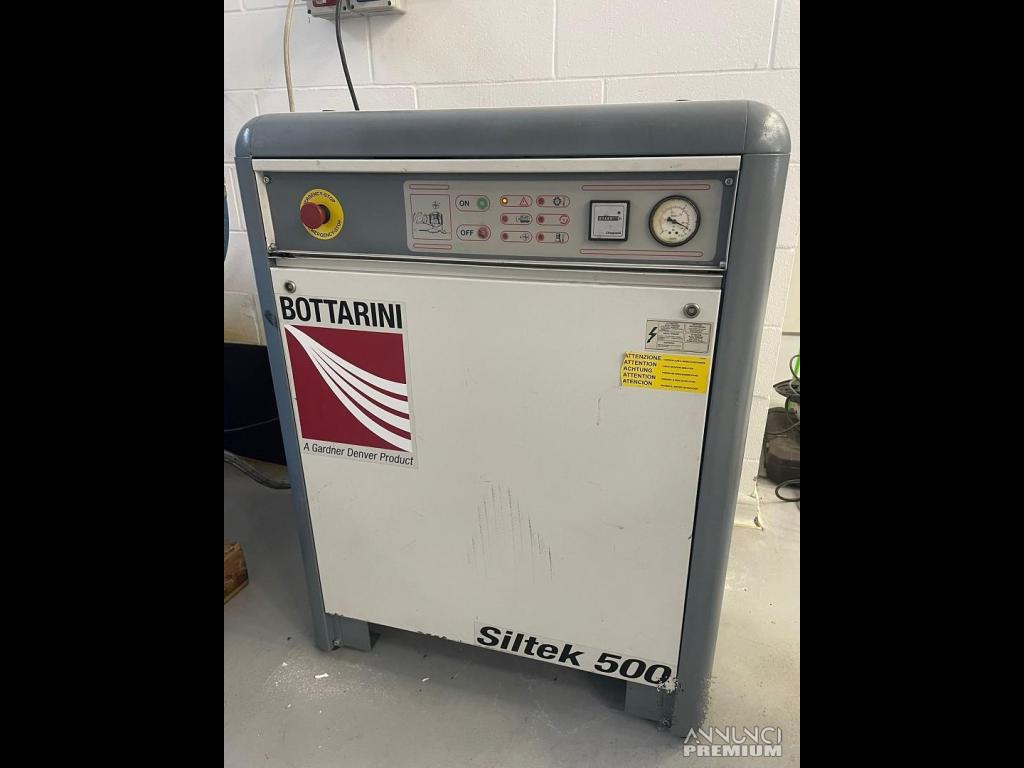 compressore d'aria silenziato della marca Bottarini, modello Siltek 500. Tecnologia: Compressore a vite silenziato, parte della linea Gardner Denver. Caratteristiche: Pannello elettrico a bassa tensione, pulsante di emergenza, contaore, manometro e valvola di sicurezza. Raffreddamento: Ventilatori elettrici controllati da sonde termostatiche. Manutenzione: Pannelli completamente rimovibili per facilitare le operazioni.
